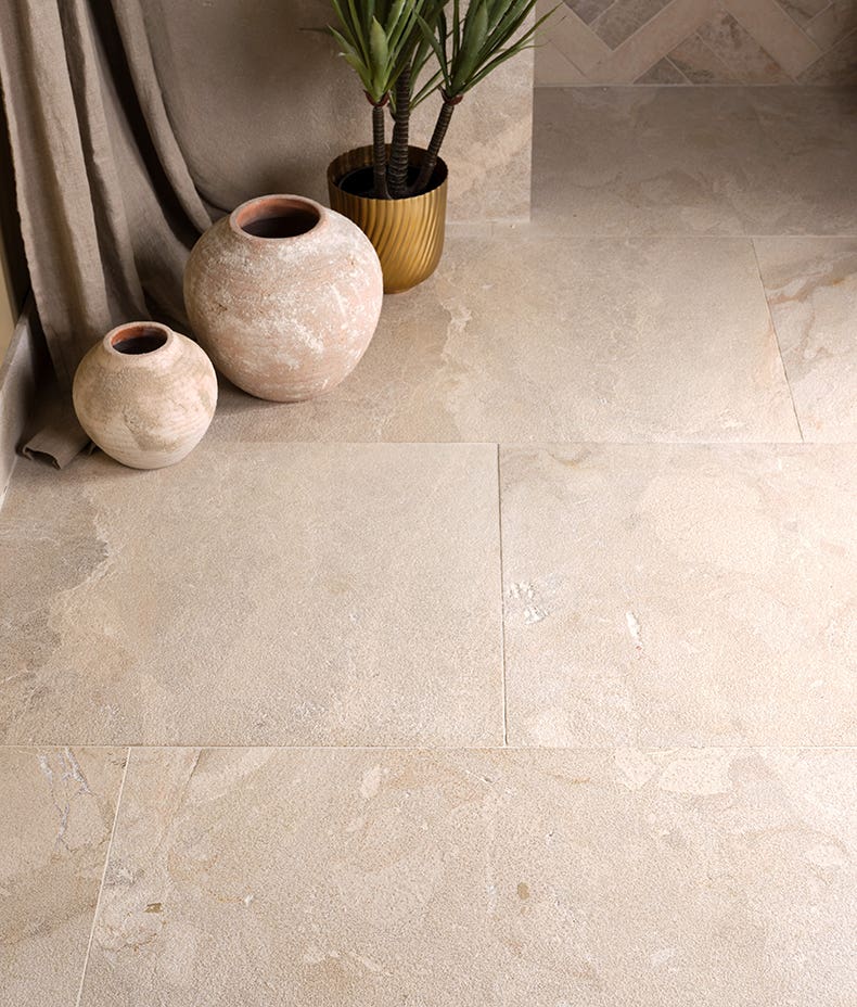 With its velvety soft finish, this limestone feels great underfoot and looks stunning over large areas. Enki features lots of natural variance, with swirling veins and patches of taupe, cream, white and warm grey.