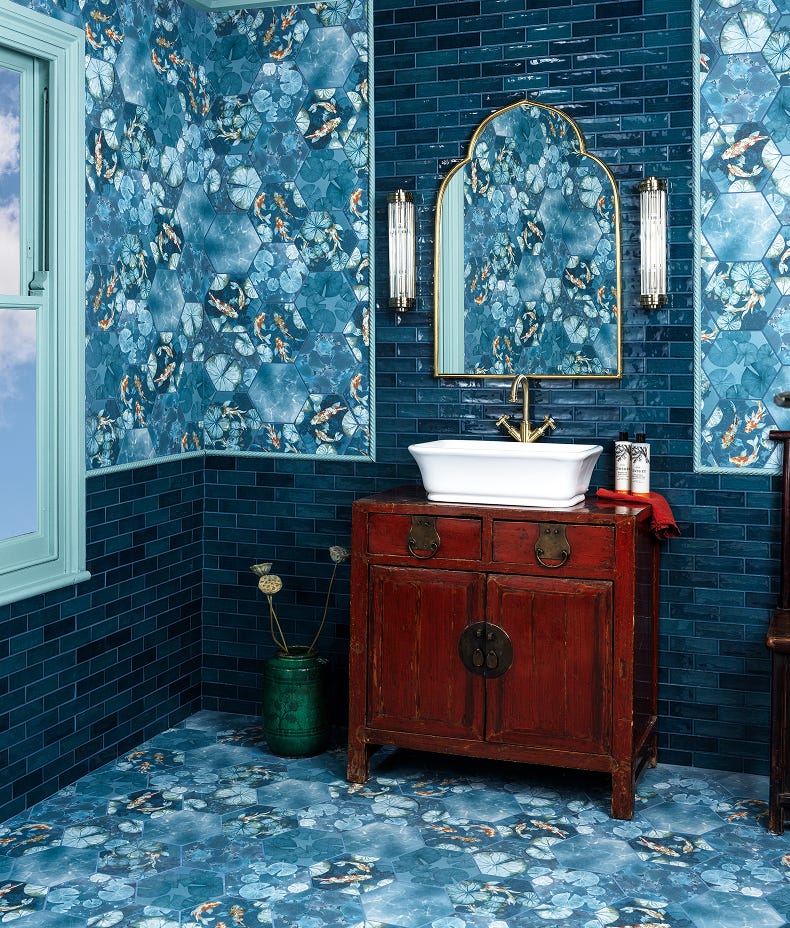 Bring the quiet calm of a traditional Japanese garden into your bathroom with Kiyosumi, featuring a detailed and intriguing blend of designs showing koi carp, lily pads and rippling water.